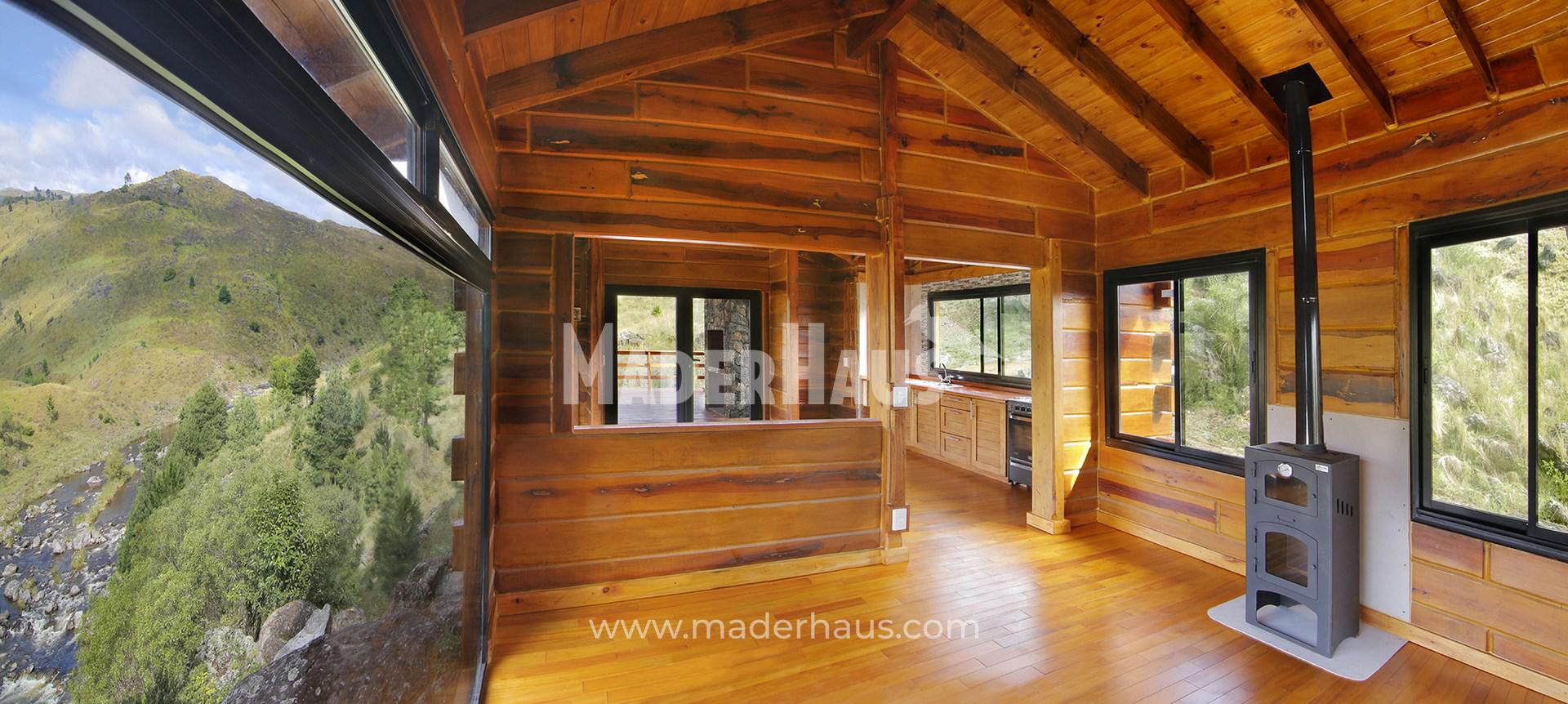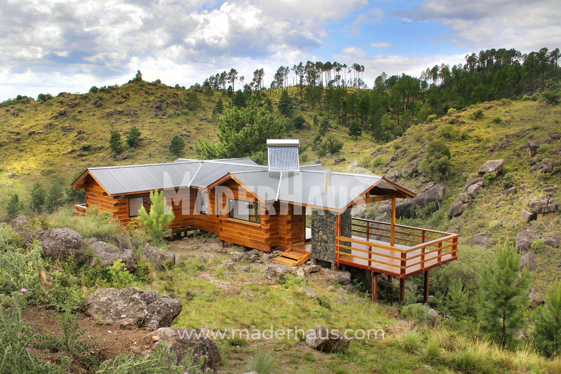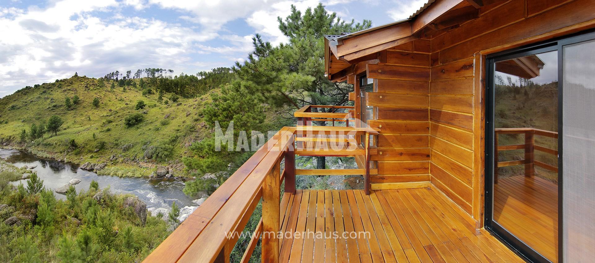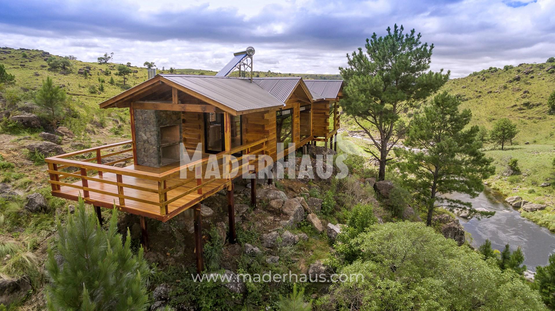 Esta Cabaña Premium de Quebracho construida sobreelevada está ubicada frente al río el Durazno, uno de los más caudalosos y cristalinos de las sierras cordobesas, en una zona alta, con vistas increíbles que recorren las curvas y ollas. Cuenta con dos dormitorios, living comedor, amplia cocina, galería con asador, baño y antebaño. Todas las habitaciones con ventanales. La cabaña de quebracho tiene unos 100 m2 cubiertos y 40 m2 de galería.